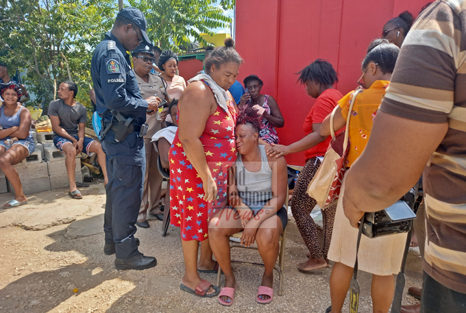 Natalie Eubanks (seated) is being consoled by relatives as she mourns the loss of her sister Sasha-Gay Eubanks who was among three persons killed at a football match in the community on Sunday. (OH News Photo)