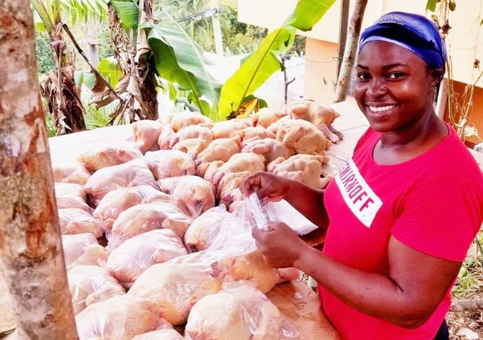Denise Williams Bailey, Head of Denden’s Farm and Supplies in Clarendon, prepares chicken for delivery.