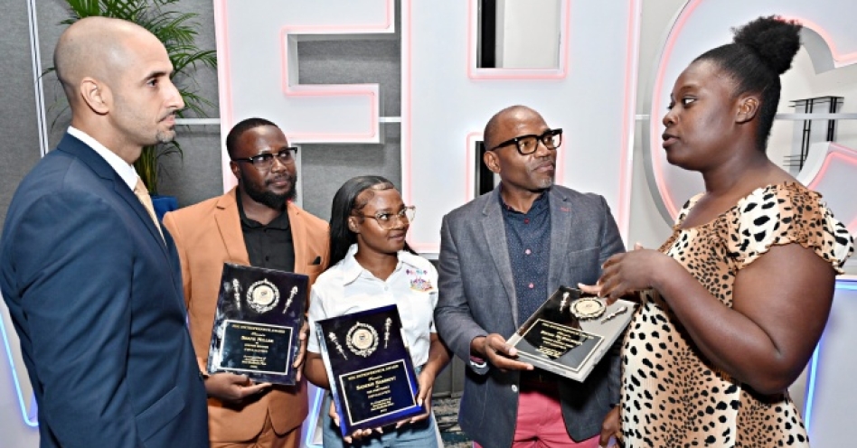 FHC Credit Union 2025 Entrepreneurship winner Renae McEachron (right) owner of Breezy Castle Farm discussed the win with CEO Xavier Allen (second right); and (from left) Jeffrey J. Azan, business consultant and motivation speaker; Shane Miller owner of Stevos Weavos; and owner of The Party Vault Sadekie Harriott.
