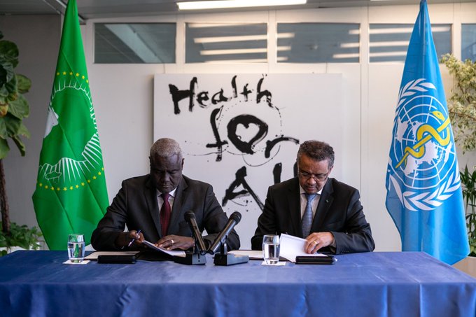 WHO Director-General Tedros Adhanom Ghebreyesus and AU Chairperson Moussa Faki Mahamat signed a Memorandum of Understanding (MoU) at WHO Headquarters to expand their relationship and cooperation in this arena.