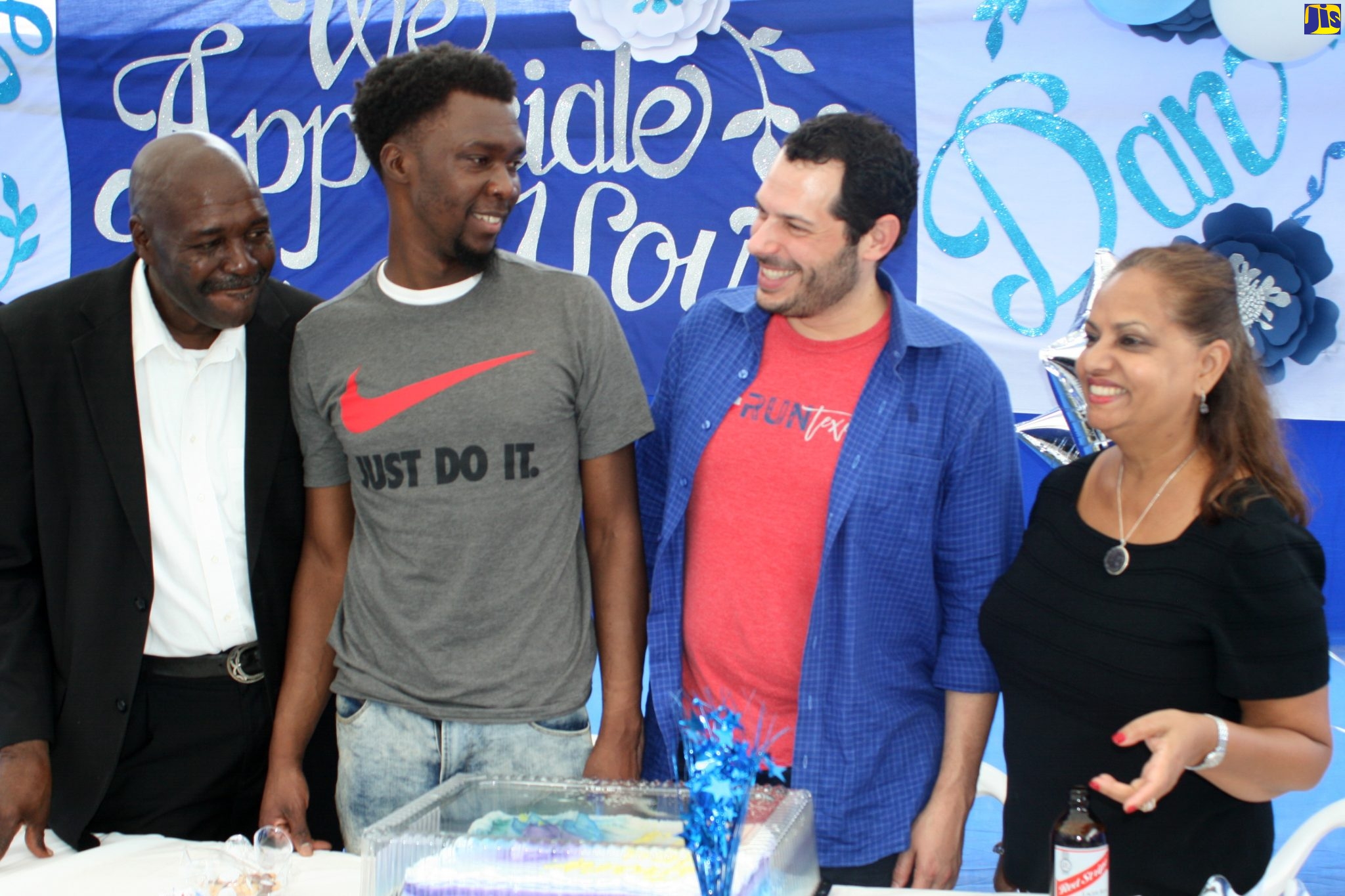 Kidney donor, Kirk ‘Dan’ Cross (left), and kidney recipient, nephew, Kasey Tulloch (second left), share a happy moment, at Mr. Cross’ residence in Kitson Town, St. Catherine, at a ‘Thank You’ lunch, on February 29. With them (from left) are Assistant Professor of Surgery at New York University (NYU), Dr. Bruce E. Gelb, and Administrative Nurse at NYU, Margaret Frank Bader. (JIS Photo)
