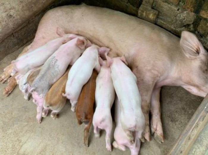 A sow feeds her piglets on Giovanni Morris’ farm in Boston Bay, Portland.
