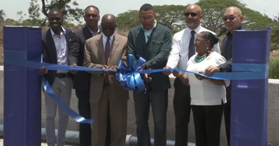 Prime Minister Dr Andrew Holness (centre) and Member of Parliament Everald Warmington lead the symbolic ribbing cutting exercise marking the formal handover of the Myton Gully bridge on June 10, 2025.