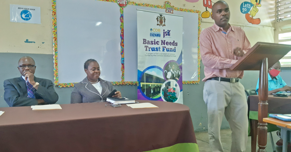 Dr Kurt Waul speaking at recent JSIF project information meeting at Marlie Mount Primary and Infant. (OH News Photo)