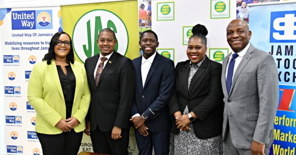 (from left) Kerry-Lee Lynch, Officer in Charge, United Way of Jamaica (UWJ), The Honourable Floyd Green, Minister of Agriculture, Fisheries and Mining; Oblique Seville, IAAF 100-metre World Champion; Deleen Powell, Manager of Public Affairs, Director of Scotia Foundation; and Dr. Devon Smith, Board Chair, United Way of Jamaica.