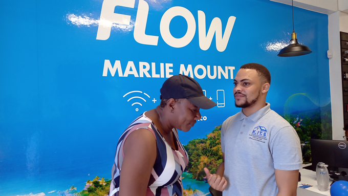 Sachin Fearon (right), store manager, Flow Marlie Mount, speaks to Sandra McNair, a customer, during its grand opening on October 25, 2024. (OH News Photo)