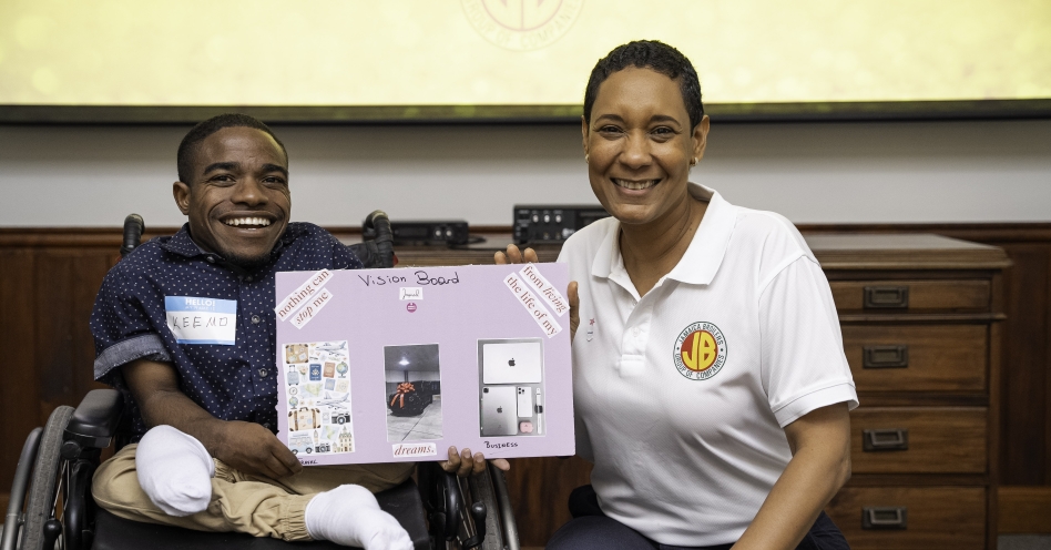 Keemo (left), resident of the Dare to Care Programme is all smiles as he shows off his vision board with Danah Cameron (right), group public relations manager, Jamaica Broilers Group.