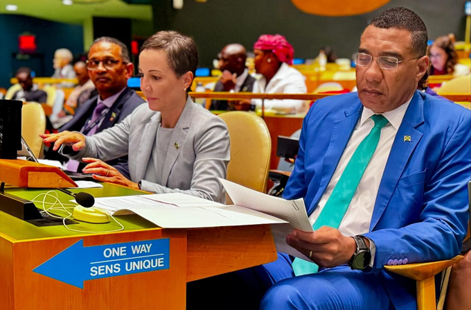 Prime Minister Andrew Holness (right) and Foreign Affairs Minister Kamina Johnson-Smith at the 79th Session of the United Nations General Assembly in New York on September 23, 2024.