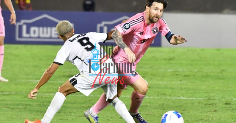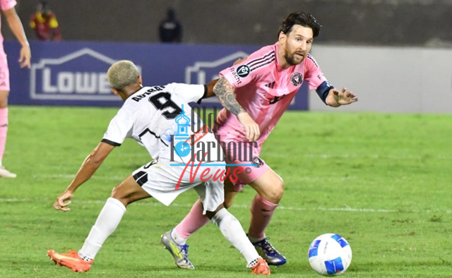 Inter Miami FC’s Lionel Messi (right) dribbles by Kaile Auvray of Cavalier FC during their Concacaf Champions League 2nd leg tie at the National Stadium in Kingston, Jamaica on March 13, 2025. (OH News Photo)