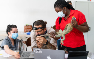 From left: Dr Kimberley Stephenson, biologist and lecturer from University of West Indies, Hope Zoo Kingston General Curator Joey Brown and Senior Reptile Keeper Jodi-Ann Blissett show the reptile to a vet at Fort Worth Zoo who watched the screening over Zoom.