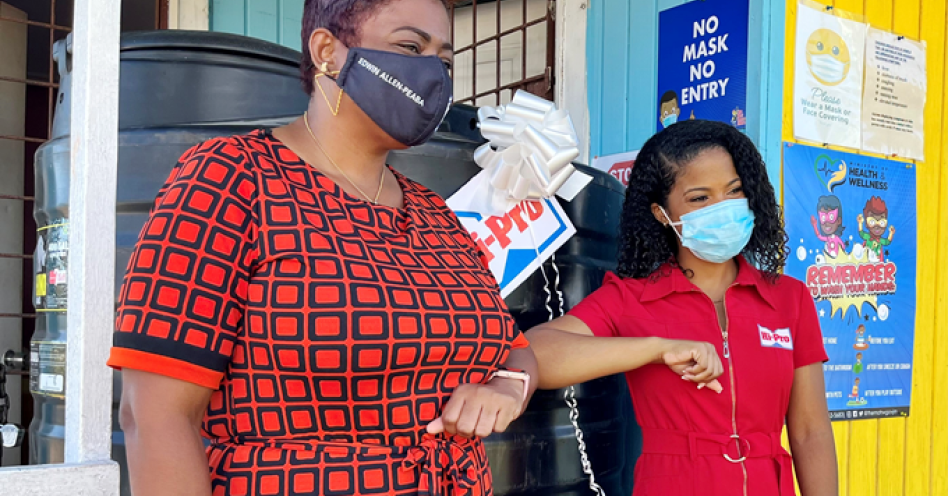 Nadisha Moore, principal of the High House Basic School and Sherrae Wong, retail manager at the Hi-Pro Ace Supercentre bump elbows as they pose in celebration of the school’s new 400 gallon water tank donated by Hi-Pro. (Contributed Photo)