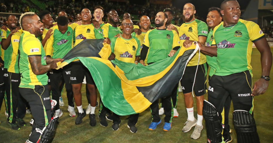 Jamaica Tallawahs celebrate winning the 2022 CPLT20 championship.
